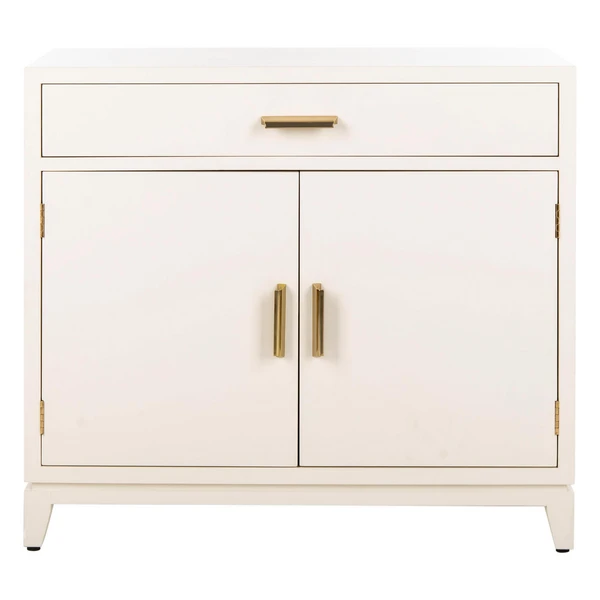 Designed for maximum versatility, this two-door chest is ideal for living room storage or perfect as a nightstand in the bedroom. Its neutral white and brass finishes blend beautifully with any style of decor.