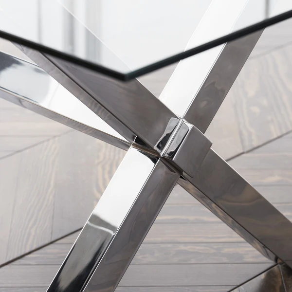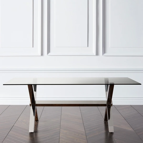 Our Axis dining table conveys a contemporary design through its lustrous finishes. A polished stainless steel base and glass top both highly reflective surfaces are a perfect complement to a modern dining room.