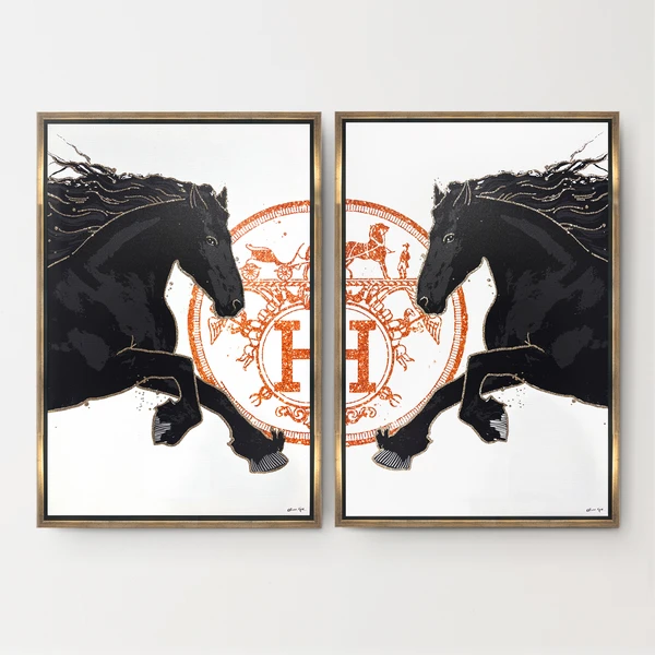 The stunning stallion embodies the sleek and glamorous qualities so appreciated in Oliver Gal’s designs. Set in a gold floating frame. Available in two sizes.