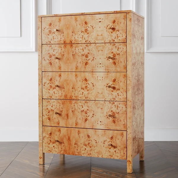 Our Brynn dresser makes a stunning focal point in the bedroom with its richly figured burl veneers and modern, clean-lined silhouette. A high-gloss finish and brass hardware complete this luxe design.