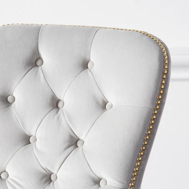 With its gentle curving silhouette, our sophisticated Charlotte Dining Chair effortlessly elevates the style of any room. Plush upholstery and hand-applied nail head details atop wooden legs make our Charlotte Dining Chair both refined and versatile. A pull ring matching the nailheads adorns the back of each chair. Shown in Bella Velvet Dove with golden nailheads.