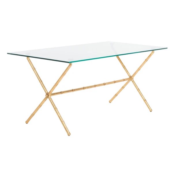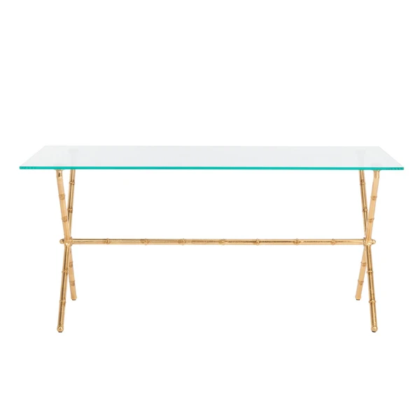 Finished in polished silver, this iron coffee table has a stylized base reminiscent of bamboo and a sleek, rectangular top made of tempered glass.