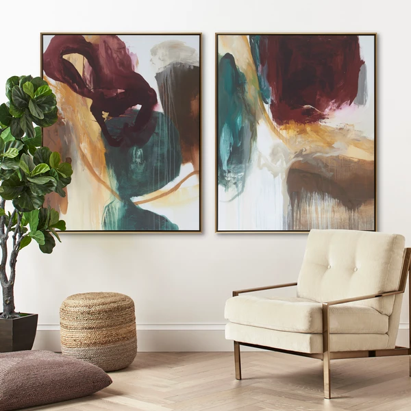 This beautifully layered abstraction from artist Jean Kenna showcases versatile neutral tones with pops of plum and teal. Printed on canvas with a hand-applied image brush gel finish for added texture, this piece is displayed in a gold floater frame.