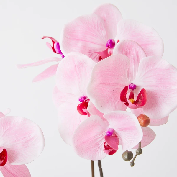 Make this faux orchid a feature of your space. Its cheery pink hue and white ceramic vase will add charm and character to any room.