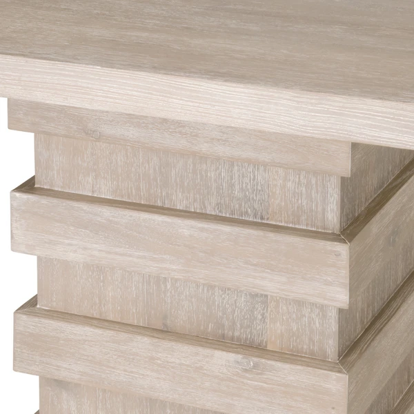 This extension dining table features a double pedestal base with a stacked column design. It is crafted with acacia wood with natural gray undertones and comes with two removable extension leaves. Comfortably seats up to 10 people with both table leaves inserted.