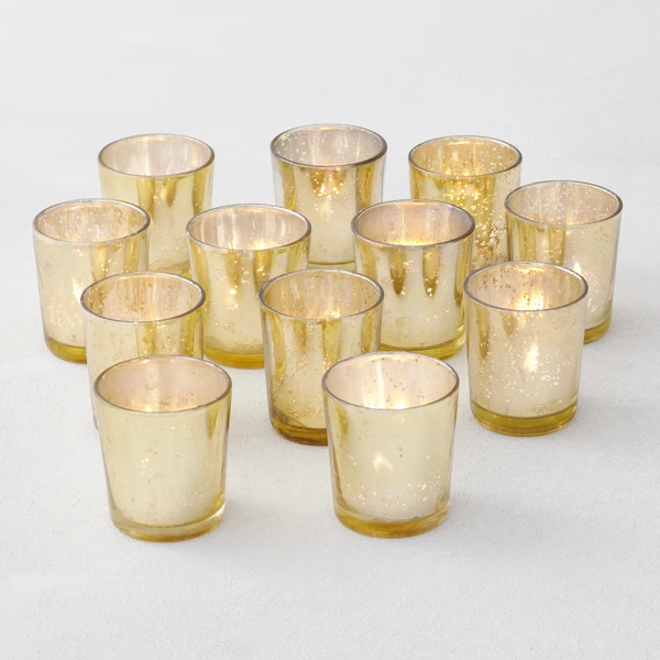 Packed with panache in one compact collection, our shimmering gold set of twelve votive cups may be used in countless ways to bring the warmth of candlelight to your home. Exclusive to Z Gallerie, the votive cups are crafted of clear glass with a sparkling gold metallic finish applied to the interior, to create the coveted look of antique mercury glass. Include them with other candle holders or with a collection of decorative objects. The set is packaged in a clear acetate box to give as a gift if you like. Use with standard tea light or votive candles (not included).